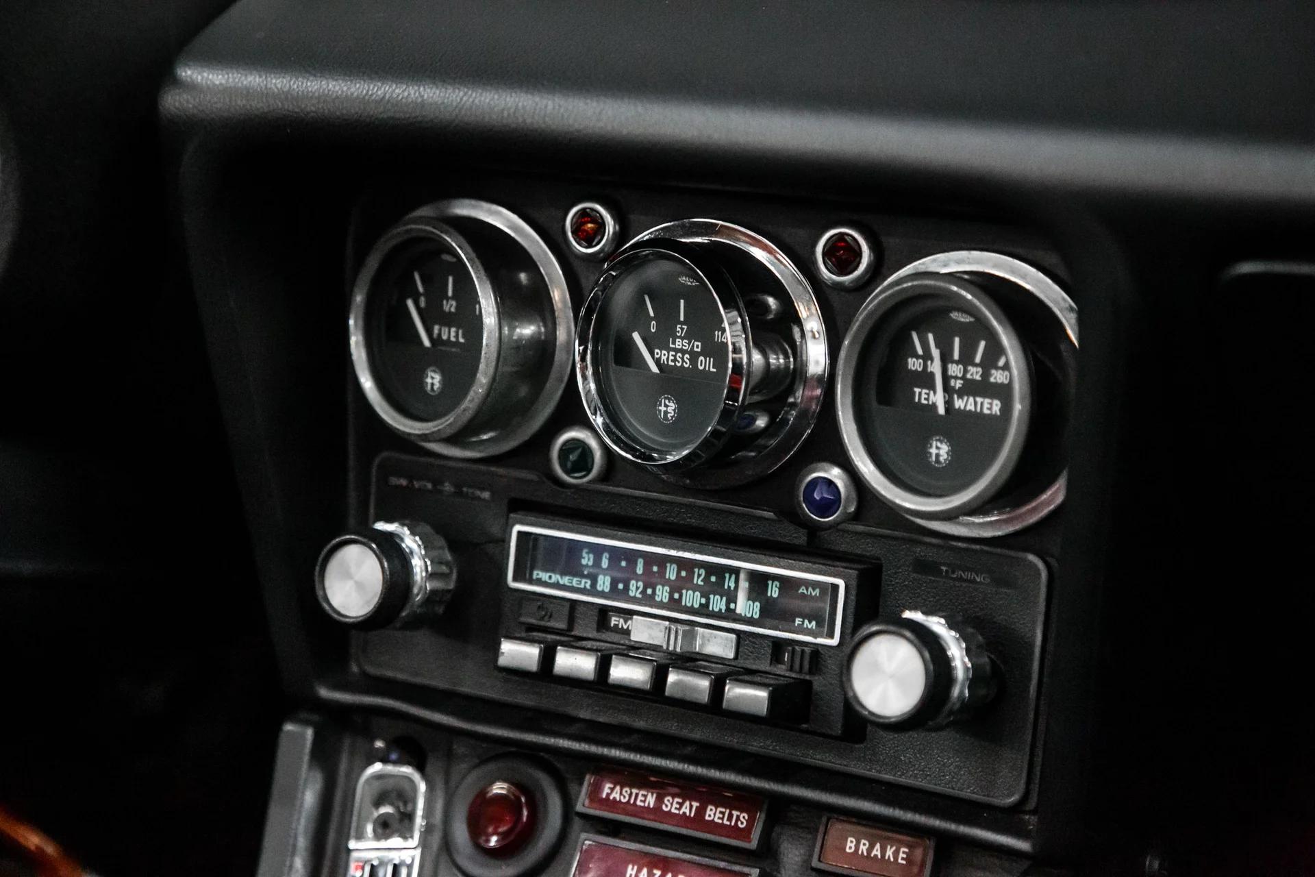 The front bucket seats are trimmed in black vinyl upholstery and are complemented by a color-coordinated dashboard, door panels, and floor coverings. Appointments include a wooden shift knob, Alfa Romeo-branded rubber floor mats, lap belts, and crank windows. The door cards, heater fascia, stop top catches, and anti-rattle straps were replaced in 2024