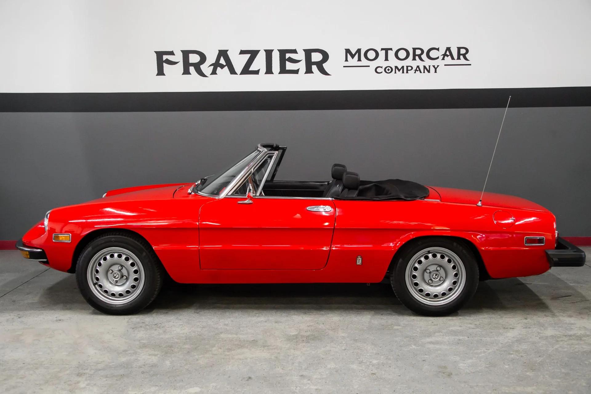 Installation of an Alfaholics fast road suspension kit, a stainless-steel exhaust system, 15″ GTA-style alloy wheels, an early Kammtail front bumper conversion, and replacing rear trailing arms, spring pans, weatherstripping, door cards, interior trim, and more. Powered by a 2.0L twin-cam inline-four linked with a five-speed manual transmission, the car is finished in red over black vinyl upholstery. Equipment includes a replacement black canvas convertible top, power-assisted disc brakes, and a wood-rimmed Personal steering wheel. owner's manuals, recent parts, and service records