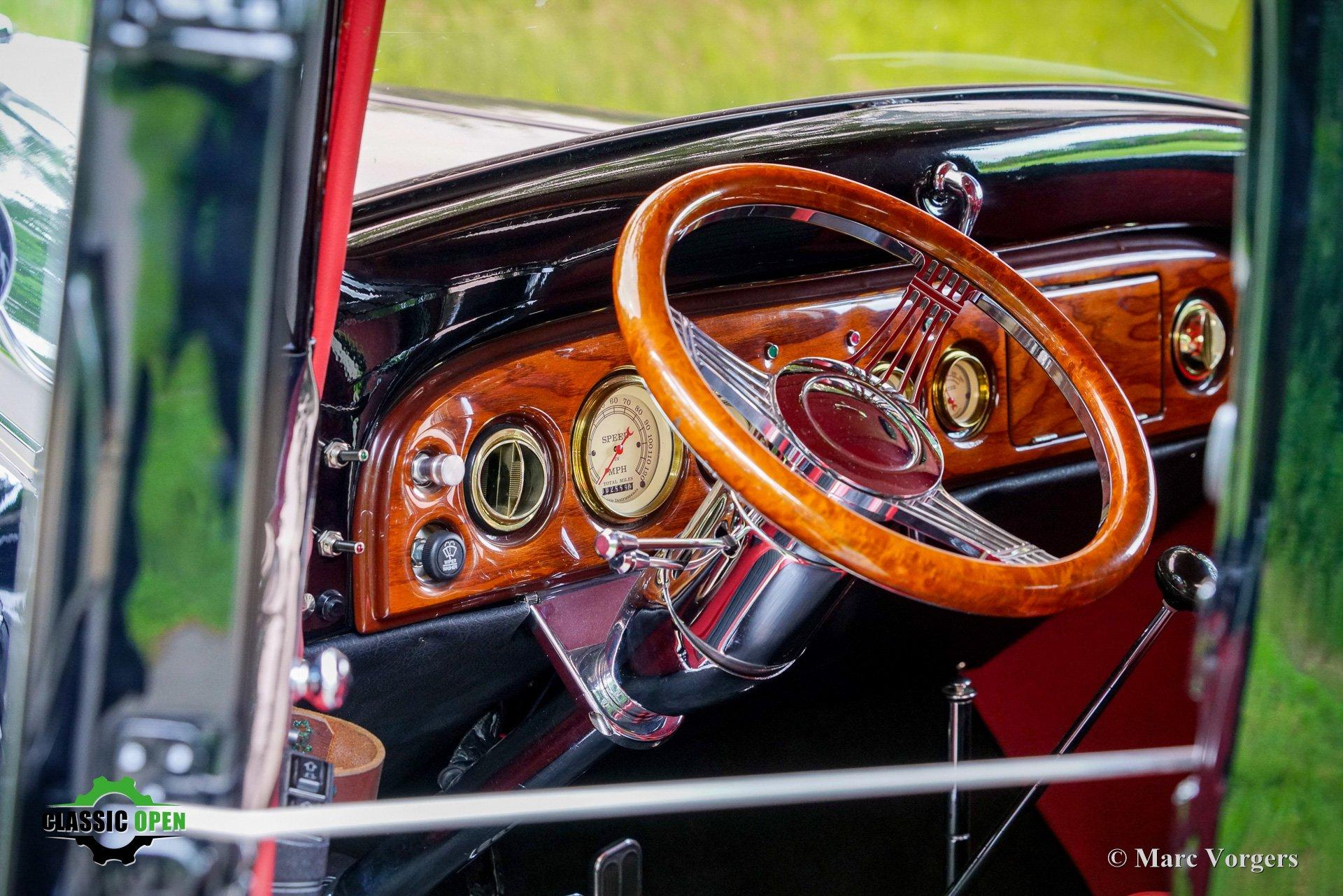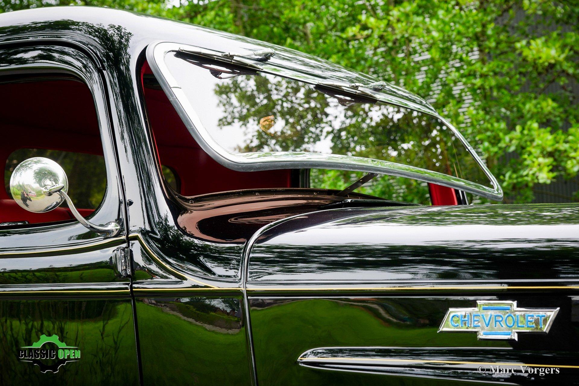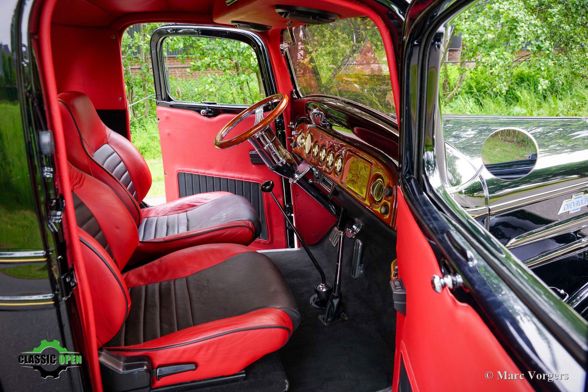 Deze Chevrolet Pick-Up uit 1936, uitgevoerd in zwart met een roodlederen interieur, is in Nederland uitgebreid gerestaureerd en gemoderniseerd.